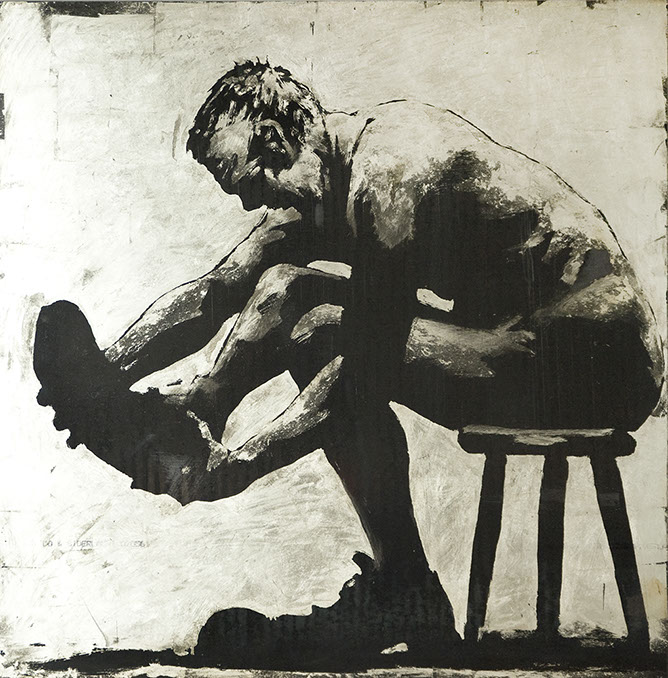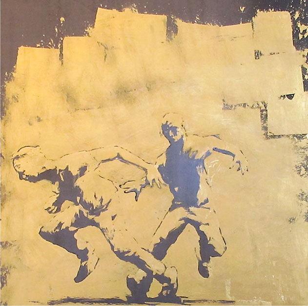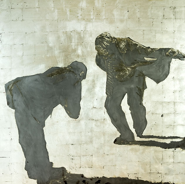 Omaggio all’incisione di Paul Klee del 1903 Zwei Männer, einander in höherer Stellung vermutend, begegnen sich (due uomini si incontrano, ogniuno supponendo che l’altro possa essere di rango superiore). La scelta della foglia d’oro bianca su acciaio riecheggia alcuni degli aspetti visivi di un’incisione, mentre l’immagine descrive i riti eterni e spesso ridicoli di gerarchia sociale, contrapponendo i gesti di corte, a quelli di uomini d’affari contemporanei, nel contesto di un piano pittorico, implicitamente ambiguo.