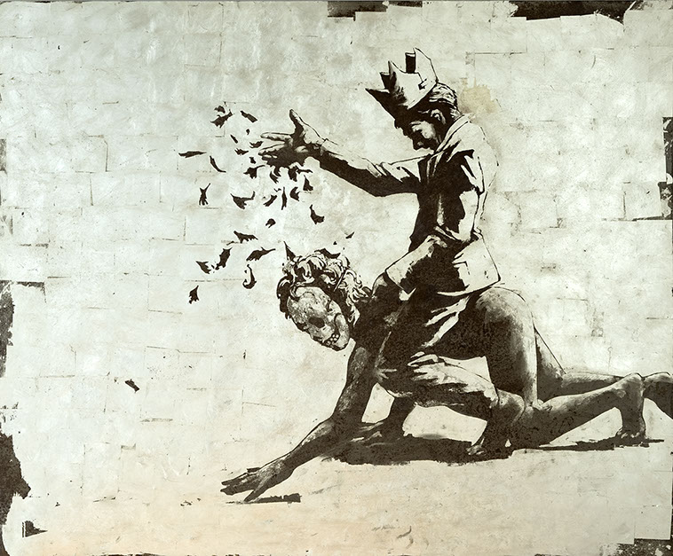 Ispirato da entrambi: “riding with death” di basquiat dove un uomo griot cavalca uno scheletro, e la penultima scena de “la dolce vita”. Complicità, ambiguità, giochi di potere. I riferimenti alle stampe popolari messicane d’inizio secolo sono evidenti, anche nel titolo. I “calaveras” mettono la morte come personaggio al pari dei vivi. E la mente cavalca nelle praterie dell’immaginazione fra i tormenti del cristo di bosch e gli spettacoli della passione medioevale.