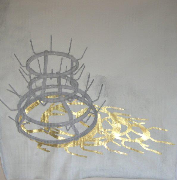 DIAGRAM (Carboncino, Acrilico, Foglio d'Oro su Tela) | La pretesa di Marcel Duchamp di neutralità estetica è, se non ipocrita, forse datata per sua stessa opera. Ormai apprezziamo la portabottiglie usata per il primo readymade per le sue proprie qualità formale, oltre alla sua storia. La forza di quella storia è dimostrata dal fatto che pensiamo subito a Duchamp quando vediamo, anche fuori contesti artistici, una portabottiglie dello stesso tipo. La sua ombra è ben più lunga e luminosa dell'oggetto stesso. Dunque il titolo di questo quadro. Se non altro la forma della portabottiglie sembra lei stessa uno diagramma: simmetrica e gerarichica.