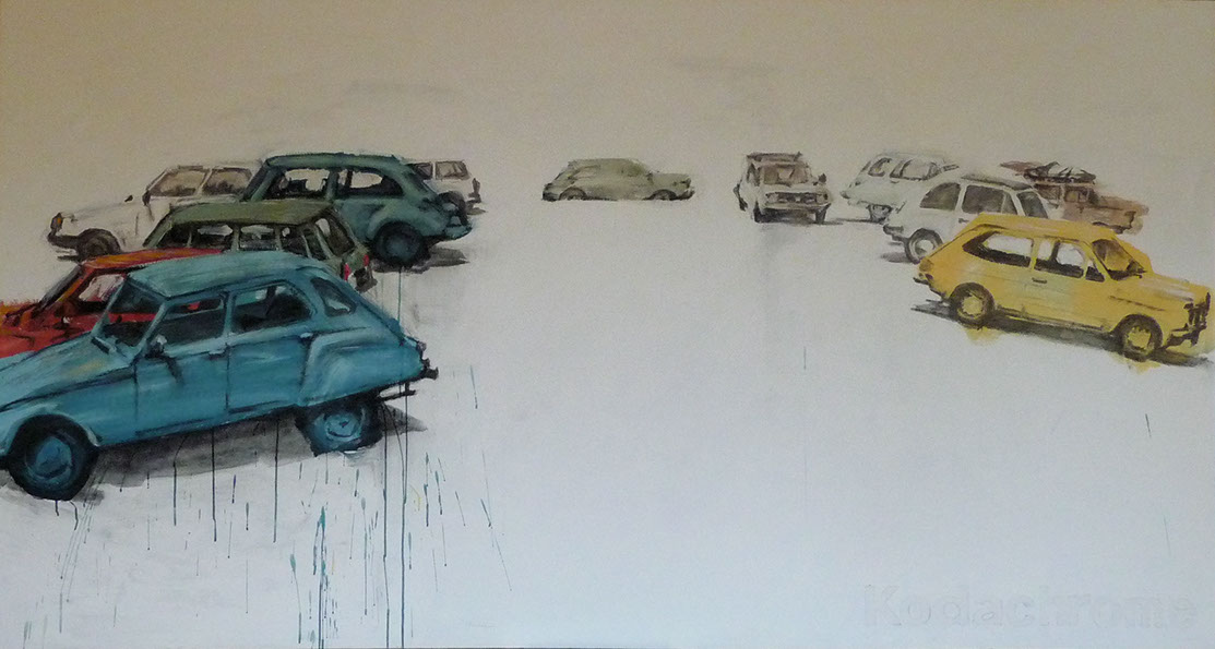 KODACHROME (Acrilico su Tela) | Una gigantografia di una cartolina postale dagli anni '70. Della piazza medievale rappresentata, circa 30% rimane coperta da macchine parcheggiata; come se fossero le cose più importante del paese. Quello che viene filtrata (soprattutto inavvertitamente) durante la rappresentazione del mondo indica tanti aspetti dei nostri priorità, pregiudizio, ambizioni… La cartolina ed il quadro hanno entrambi un equilibrio cromatico che ci appare artificiale, che rimanda al processo di filtraggio di cui sopra. Casualmente nel periodo che questo quadro venne fatto Kodak tolse dalla produzione Kodachrome, la prima pellicola fotografica a colore distribuita commercialmente; che sicuramente ebbe un influenza sula percezione del color e la sua rappresentazione su scala mondiale.