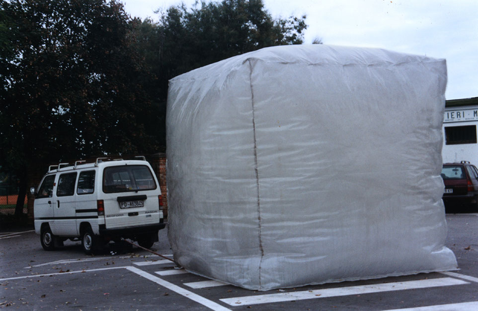 SERRA (Automobile, Polieteilene, Gas di Scarico) | Ogni giorno siamo bombardati di statistiche su quanto inquiniamo: tonnellate di rifiuti, metri cubi di anidride carbonica ecc... ma queste statistiche sono astratte come lo scioglimento dei ghiacci polari. Sembrano non riguardare la nostra vita quotidiana. E' però sufficiente mettere una cornice attorno a una cosa invisibile per renderla subito tangibile. Una busta di plastica, quella appunto di una serra agricola, attaccata allo scarico di una macchina, che piano piano va a gonfiarsi per rivelare la natura vera, fisica, di quel che accade a un qualsiasi semaforo cittadino.