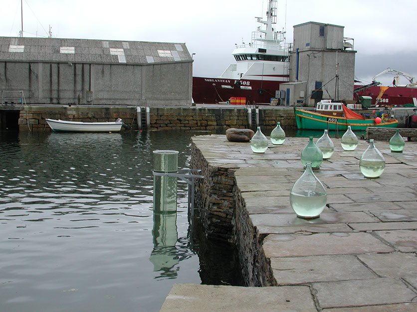 SOURCE (Con Anne Bevan - Acciaio, Acrilico, Vetro, Acqua) | Orkney, come Venezia, è un'isola e vive d' acqua, ma due isole e due acque più diverse sono difficili da immaginarsi. Source, sorgente, è un monumento alla loro condizione comune vissuta in forma diversa: una colonna d' acqua della laguna veneziana trasportata in Scozia e immersa nel mare. Una colonna d'acqua orientata verso il basso potrebbe essere la descrizione di un pozzo, di una fonte, di una sorgente….ma la possibilità di contaminazione batteriologica dà alla scultura delle implicazione più sinistre: potrebbe sembrare una enorme provetta, portando alla mente i rischi di inquinamento a cui sono soggetti entrambi i luoghi, nell'era del trasporto globale